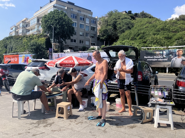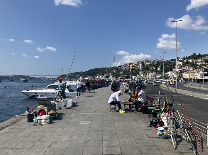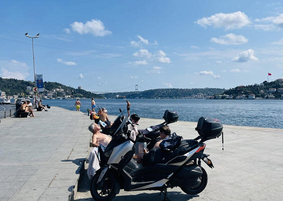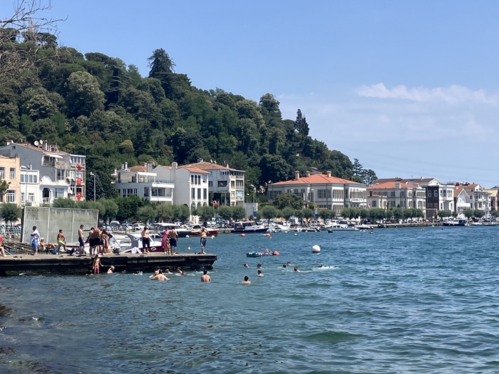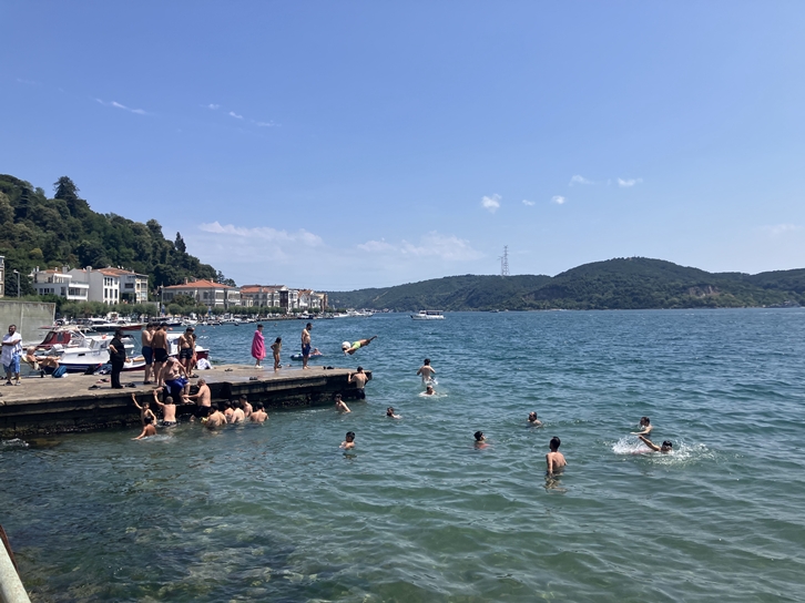 Views of the Bosphorus from the European side and people enjoying the cool currenty sea.